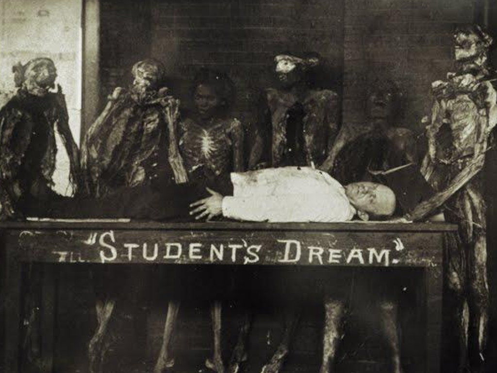 Another example of this trend in medical student photography, these photos were by no means uncommon during this era. Comic photos weren’t always easy to maintain given the era’s limited technology, but these pictures managed to compensate for lengthy exposure times because the only living person in the photos would generally be lying on their back, motionless.