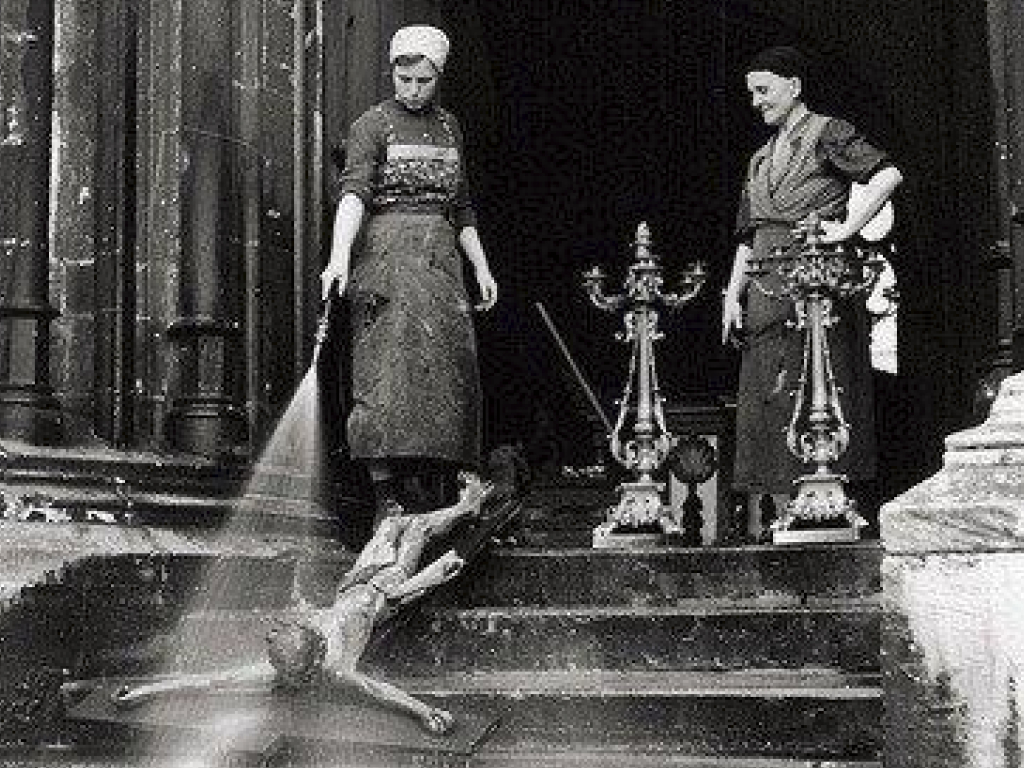 This photo, purportedly from 1938, looks at first glance like a woman is cruelly hosing down a starving child. Look closer, however, and it’s clear that she’s actually cleaning a statue of Jesus Christ upon the cross – a common sight in many Christian churches across the world. Even though this picture isn’t quite as terrifying as it initially looks, surely there must have been a better way to get the statue clean?