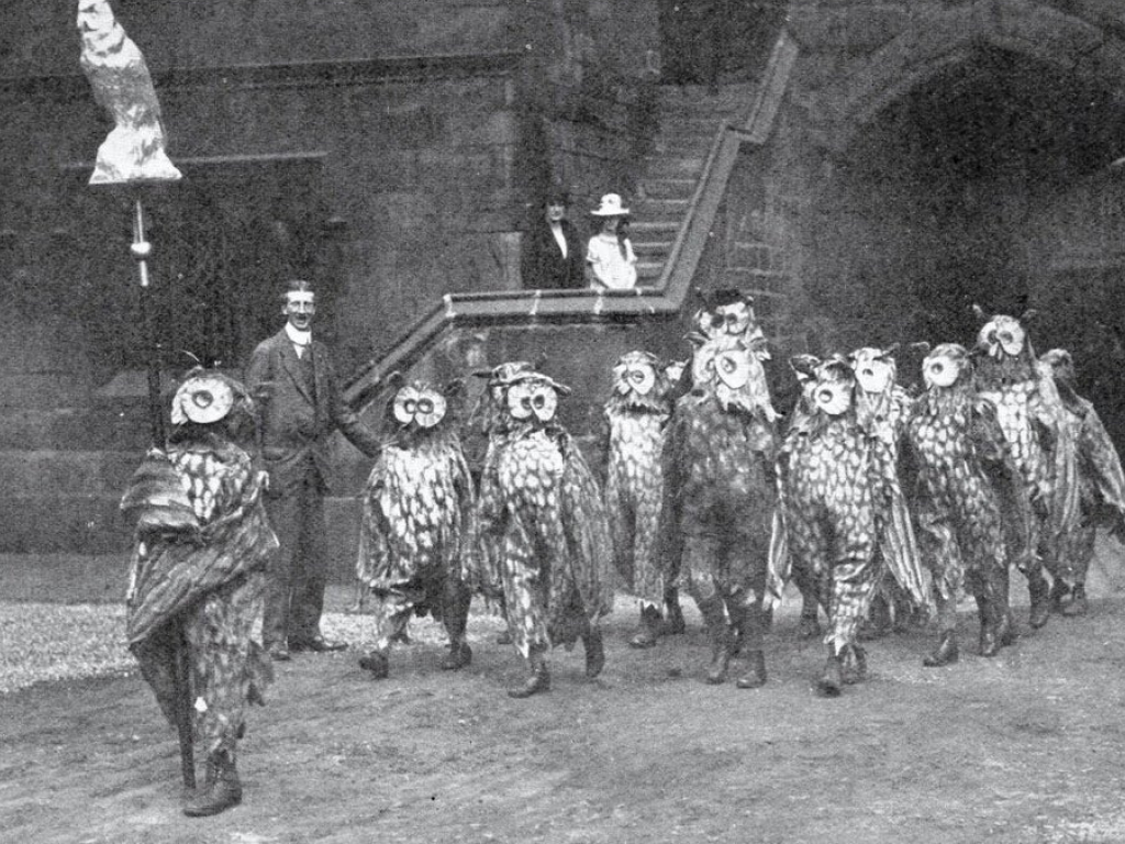 This photo depicts students at Manchester Grammar School in England in around 1920. The school’s mascot is the owl, so, naturally, the students are all dressed as owls. There’s nothing strange or unusual about that – it makes perfect sense. The owl is still the mascot of the town of Oldham, and a similar but significantly less creepy costume is worn by the mascot for the local soccer team.