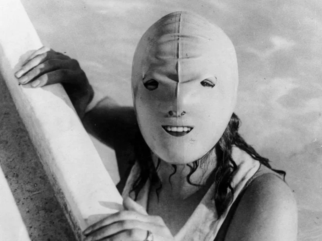 Believed to be from 1928, this disturbing full face swimming mask protected the wearer both from the water and from the sun, at a time when pale skin was considered very desirable and dark rans hadn’t yet become fashionable.