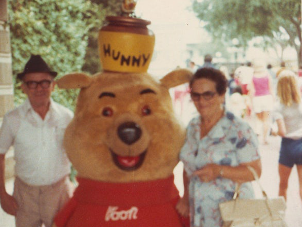 The design for this costume originally had brown eyes, but due to age and sun exposure, most photos of Winnie the Pooh in this era seem to have demonic glowing red eyes. But, the reason the costume was ultimately redesigned was because the arms in the costume were simply sewn on and couldn’t be moved. It’s nice to know that this walking nightmare couldn’t shake your hand while he stared you down.