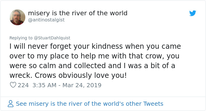 Man Feeds Crow Family For Years, Then Receives A ‘Mind-Blowing’ Gift From ThemBy Thomas Daily / January 31, 2020 Saving More Credits There has been a huge response to Dahlquist’s post. Many people have approached him with questions and sharing their own experiences of various animals leaving them gifts but they all admit the unusual nature of his story. Pages: 1 2 3 4 5 6 7 8 9 10 11 12 13 14