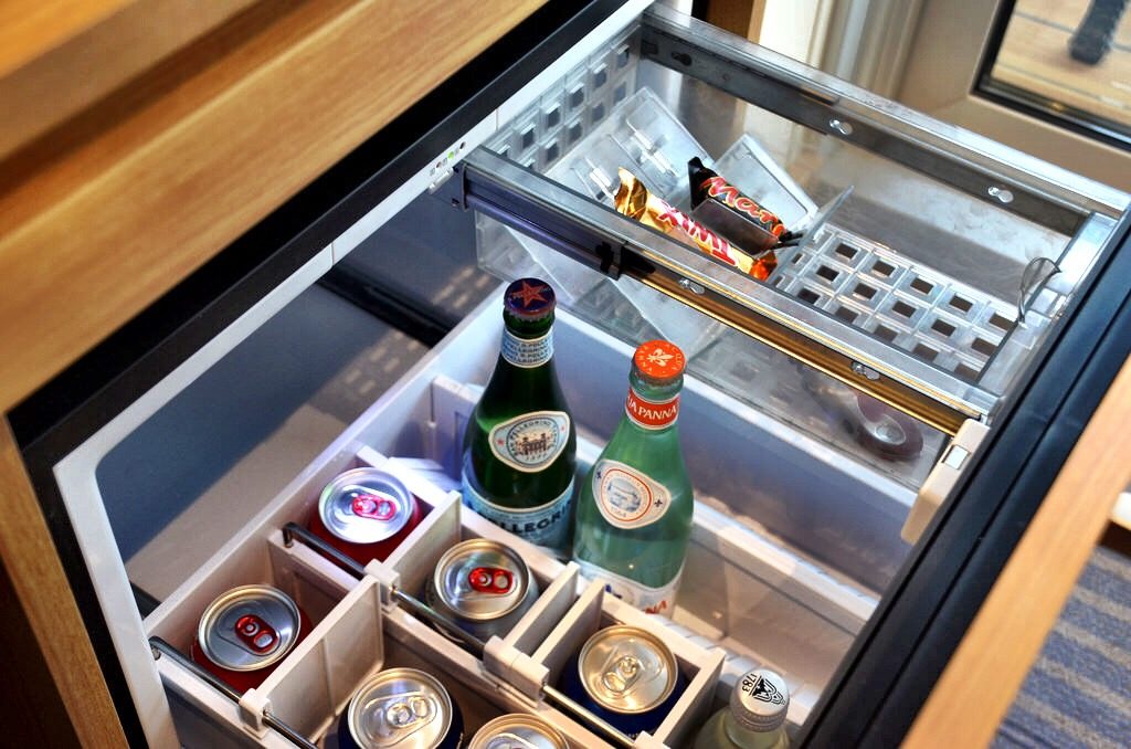 Similar to hotels, whatever you take from the mini-fridge, you’re charged for. Some people care and others don’t. If you’re not willing to spend the extra cash on a couple of travel-sized beverages, steer clear of the fridge in your room. Take a walk on the deck and grab something free of charge.