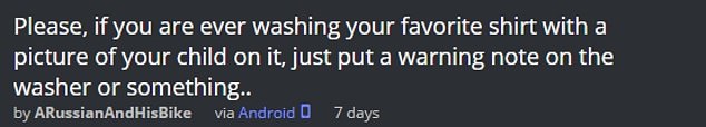 The post has not surprisingly been viewed more than 100,000 times. The poster also added his own warning to the post. ‘Please, if you are ever washing your favourite shirt with a picture of your child on it, just put a warning note on the washer or something.’