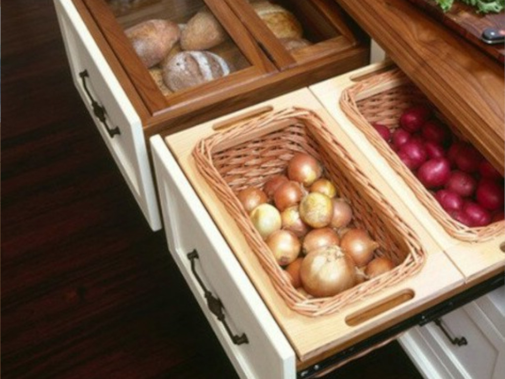 Got empty countertop drawers? Use them to hold all those veggies that are constantly taking up space in the fridge’s crisper or countertop. Add two baskets inside to separate onions from potatoes and whatnot.
