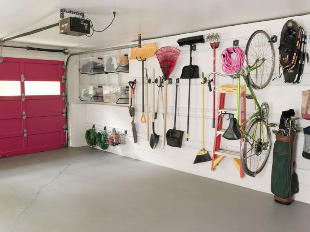 Add bike hooks to any garage wall to hang all sorts of garden tools on the wall like shovels, rakes, and even brooms and pails. Want even more space? The bike hooks can be used to hang a coiled water hose, too.