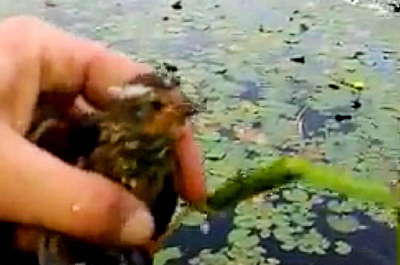 Jax swam back to shore and opened his mouth when he reached Sauer. A little bird fell out and hit the water. He was chirping and seemed completely unharmed by Jax.