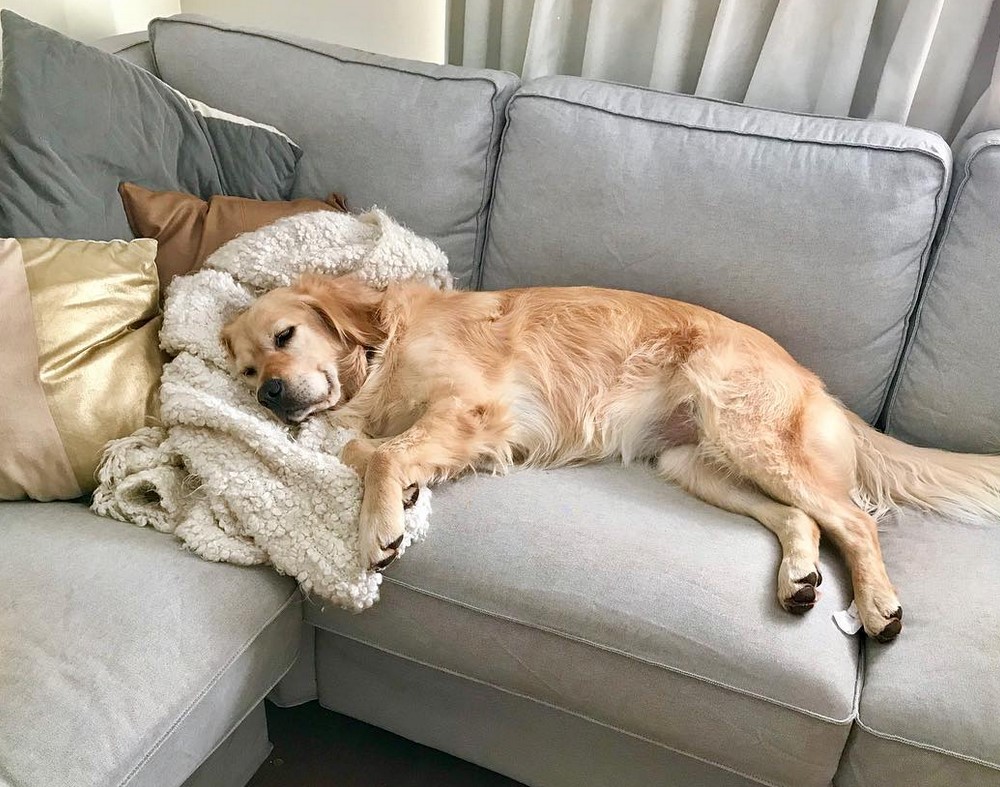 After eating her cake, the fluffy golden retriever went to take a nap on the couch. She had a full day and a fully tummy, so she deserved to take a break. She had no idea that her mom was bringing her another gift!