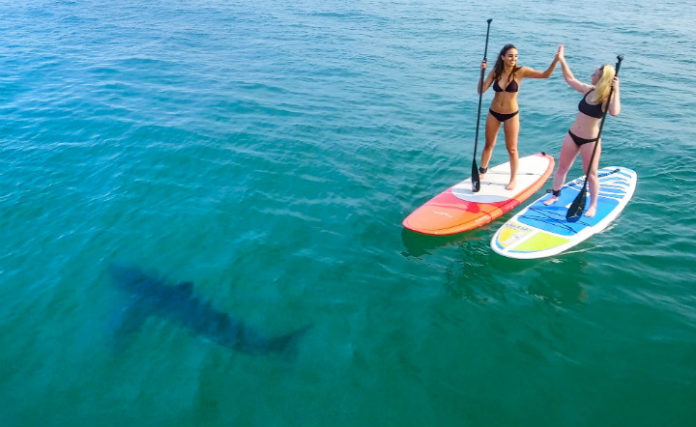 This photo is part of a documentary about the relationship between sharks and humans by Mark Romanov and Forrest Galante. It was taken off the Southern Californian coast. The two girls, called Jessica and Kelly, seem oblivious to the ominous dark shape swimming around under their paddleboards.