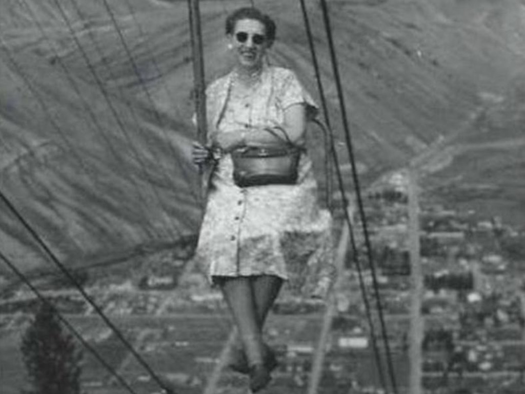 This woman was photographed riding a chairlift at the Snow King Mountain Resort in Jackson, Wyoming. This was the first chairlift of its kind installed in Wyoming. At the time, it was considered a huge convenience over riding a traditional ore bucket. And while safety harnesses and seat belts didn’t seem to be a high priority back then, this woman’s expression suggests that she wasn’t too worried about falling to her doom.