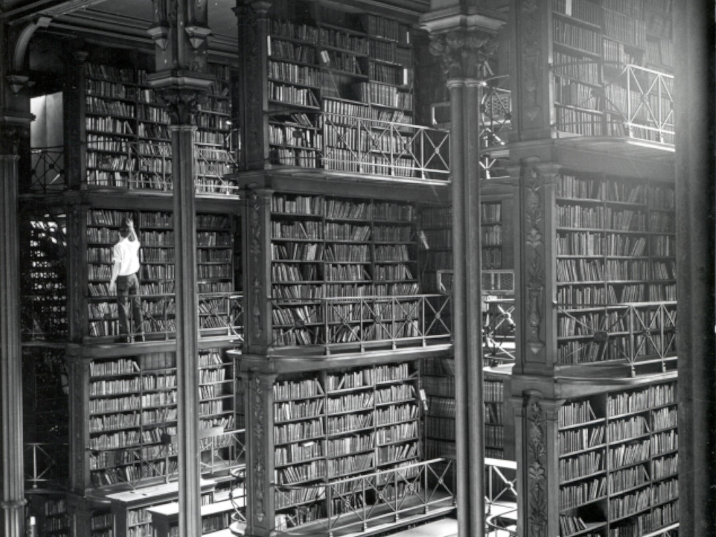 Cincinnati’s old main public library attracted scholars and book enthusiasts from 1875 to 1955. The man in this photo was standing on a cast-iron book alcove looking for a book. But the building also had other impressive features besides books such as checker marble floors and spiral staircases. Sadly, this library was demolished and exists only in those fortunate enough to witness its former glory through photographs like this one.