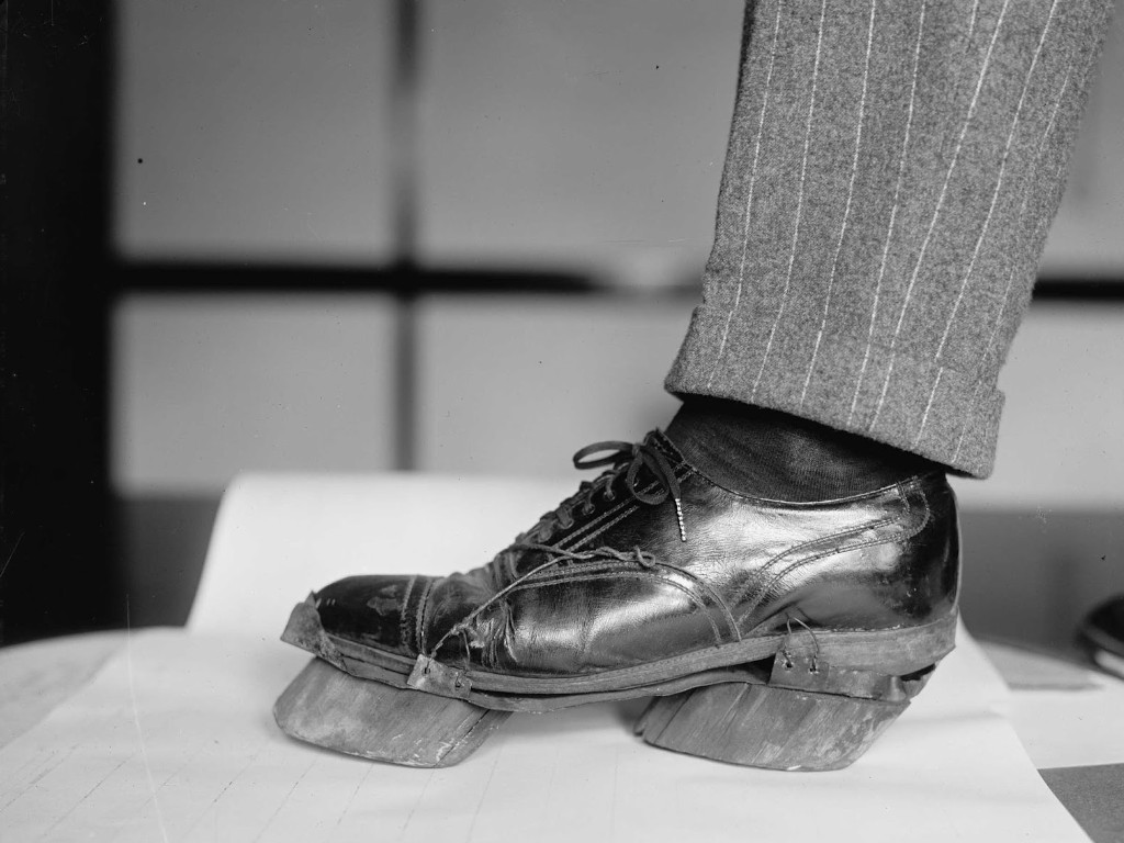 These cow shoes were an interesting fashion item in the 1920s, particularly 1924 when this photo was taken. It was worn by moonshiners during the prohibition days—the time when alcohol was forbidden by the government. Cow shoes had pieces of wood attached to the bottoms that left footprints similar to cow hoof prints. This allowed moonshiners to hide their tracks from cops while they broke the law and produced liquor for the public while bootleggers took an even bigger risk and distributed the formerly illegal substance.