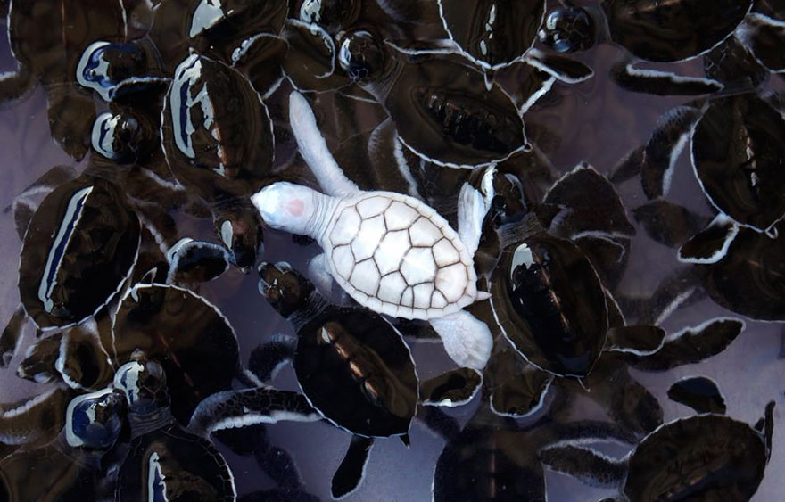 Albinism is a rare condition that causes animals to have a complete or partial absence of the white pigment in their skin, hair and even eyes in some case! Just look at this little fella how much he stands out from the other turtles.