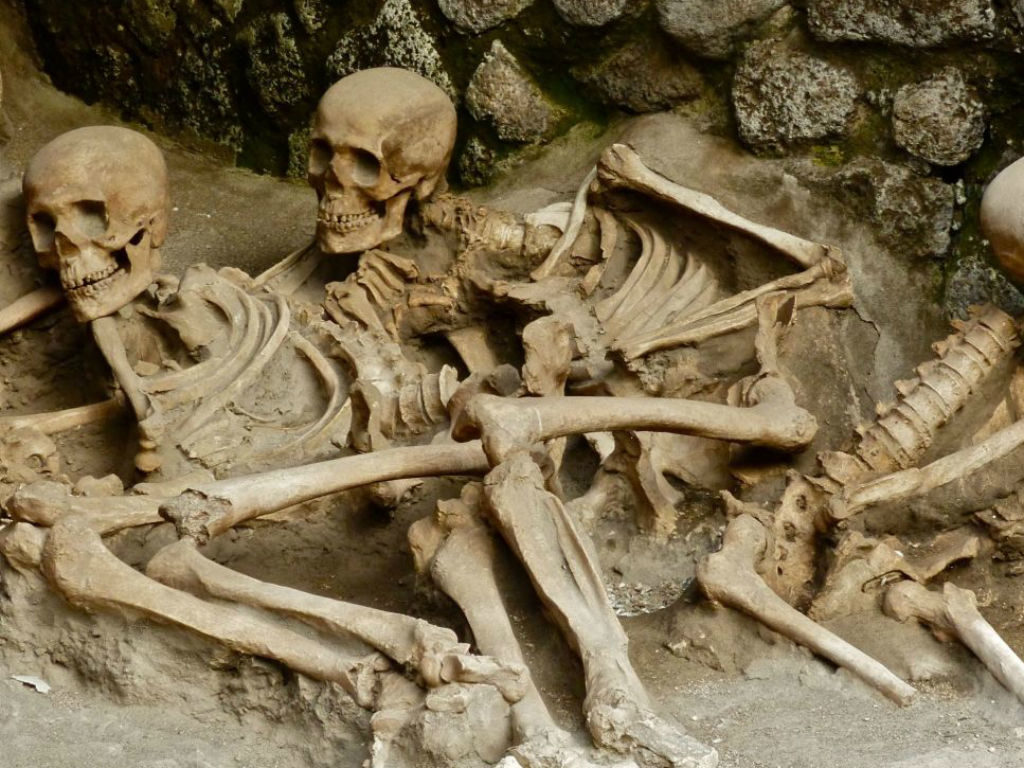 In Pompeii, the skeleton remains of humans were found hiding for their safety from the deadly heat and ash. As well as in Pompeii, over 300 skeletons, young and old, rich and poor were found embracing each other while they sought shelter in a boathouse in the neighboring city of Herculaneum.