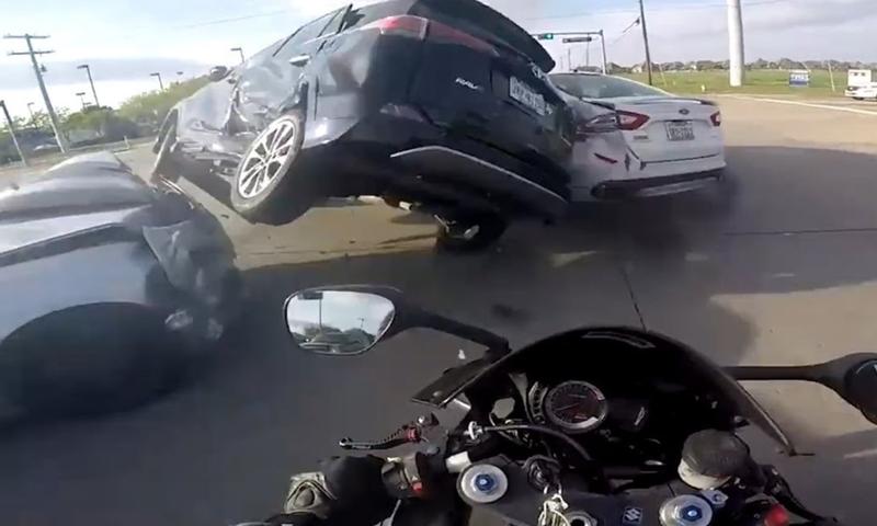 Here’s a motorcyclist who’s must be thanking his lucky stars. Getting into collisions on a bike is much more dangerous than in a car and can often be fatal if traveling at enough speed. The car in front of the biker was T-boned at the intersection they were traveling through. If the car had T-boned the biker instead he probably wouldn’t be around to recall the ordeal. Luckily he can continue to ride his bike today. Almost getting hit by a car is bad, now imagine narrowly being hit by a plane!
