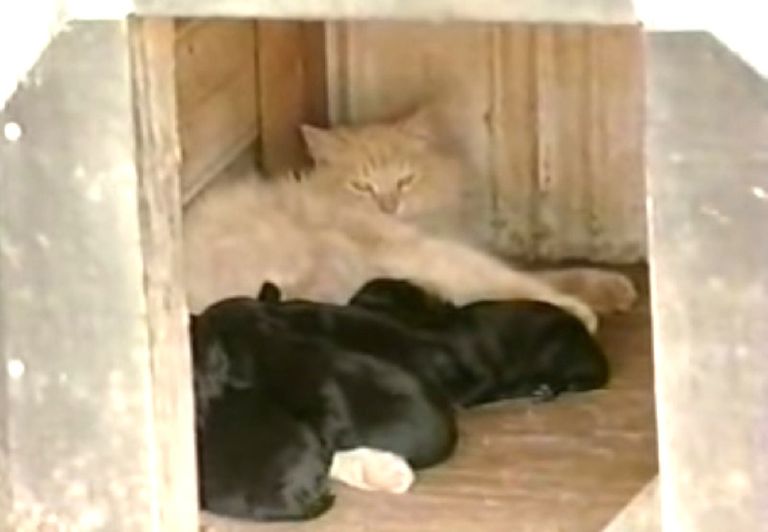 Miss Kitty was just staying in that nook with the puppies, playing and taking care of them like she was their mother! She was even feeding them with her own milk, and the puppies seemed glad to accept it.