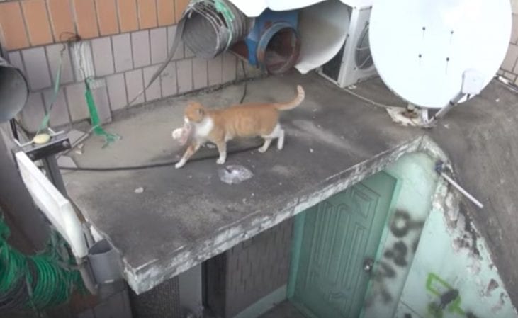 The old lady almost lost track of the cat when she jumped up on a ledge onto a terrace. But the woman climbed the stairs and found Dong-Sook, who had now stopped climbing and was instead pacing around the terrace.