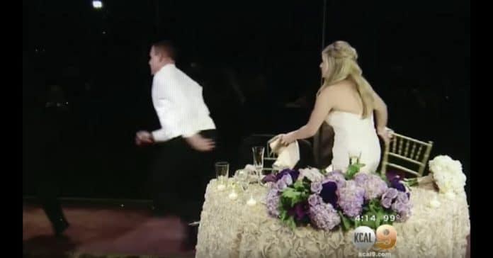 These two are Cody and Kelly Campbell during their big day. They were having the time of their lives being surrounded by loved ones and the one who was giving the speech is none other than Cody’s dad, the best man at the wedding! However, Cody felt the need to run right in the middle of the speech.
