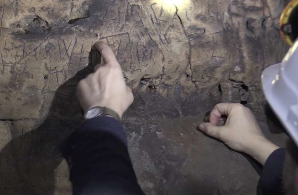 There was something about these markings that he had seen before… the way they were frantically and chaotically etched into the stone. He ran to the far wall, where the scratches were the most obvious. He ran his fingers over the etchings with his fingertips and saw that they formed the letters ‘V V’.