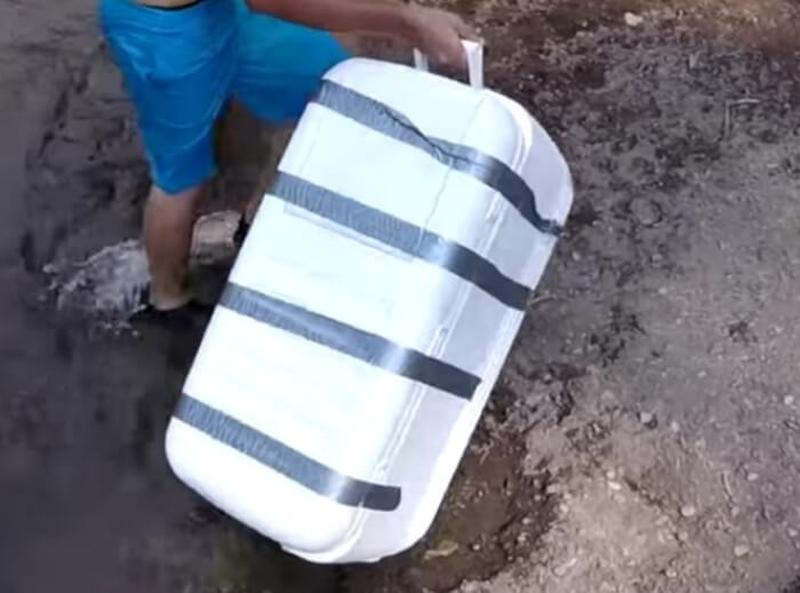 Slowly peeling off the duct tape – way too slow for us who were watching this at home! – the guys can finally take a look inside the cooler… But as the man in blue shorts tries open and looks through the cracks inside, he jumps back screaming!