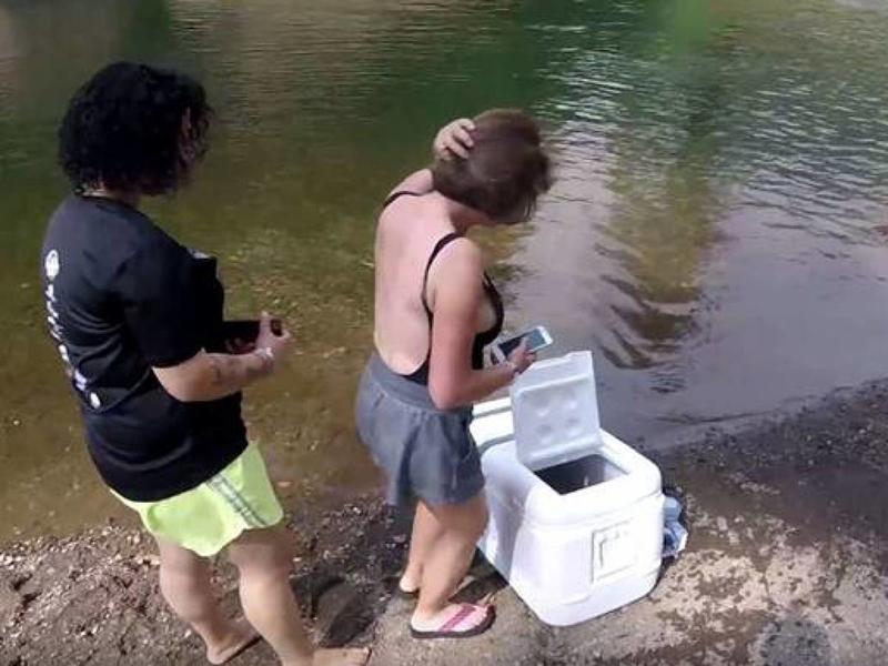 This woman already knows there’s something weird in the box, so she doesn’t jolt back like her friend. Instead, she decides to take a picture so she can show other people this creepy cooler on the river. That’s a weird memory we’d rather not share or keep…
