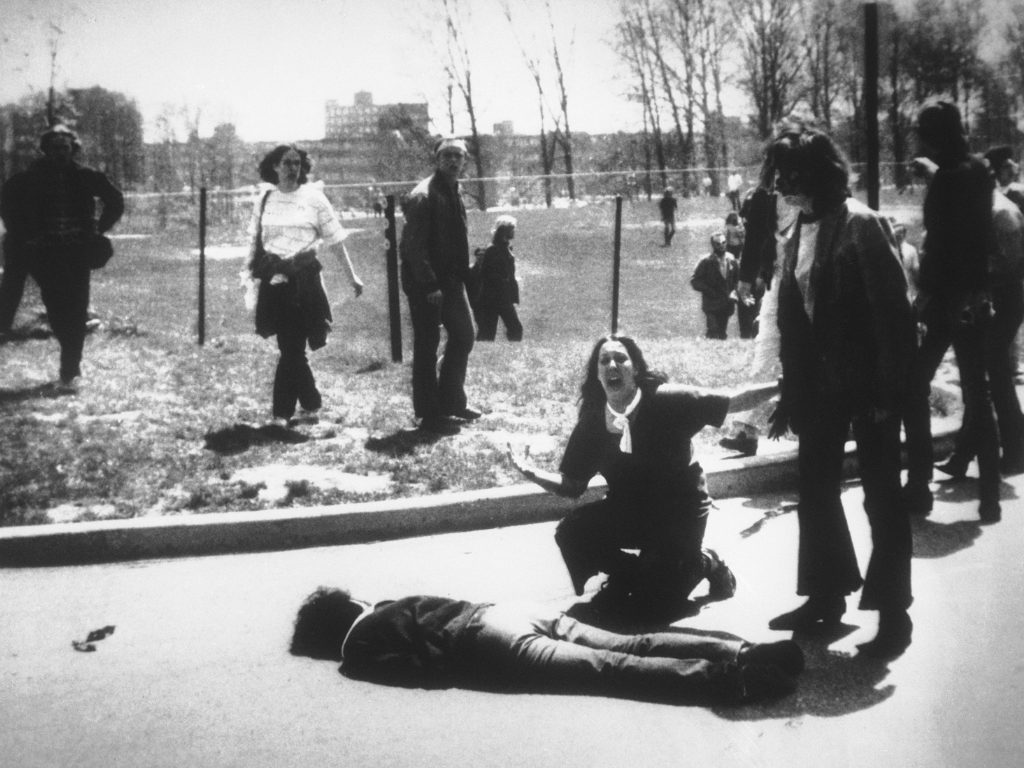 On April 30, 1970, President Richard Nixon announced that the U.S. would participate in military action against the neutral territory of Cambodia. Protests against the bombing erupted around the country. On May 4, members of the Ohio National Guard opened fire on unarmed protesters at Kent State University, killing four students and wounding nine others. This was one of the earliest incidents in a decade that was defined by the mainstream American public losing faith in their authority figures.