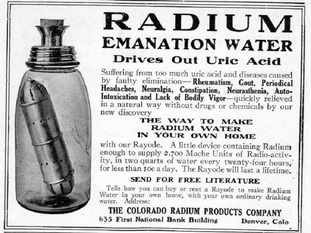 Before the knowledge of radioactivity, humans praised radium for its natural goodness. Water was kept in radium-laced buckets, and people would drink the deadly liquid to cure illnesses such as arthritis and impotence. Soon everyone started dropping dead and the connection was made. Today we use drugs with non-radioactive properties to cure arthritis and impotence.