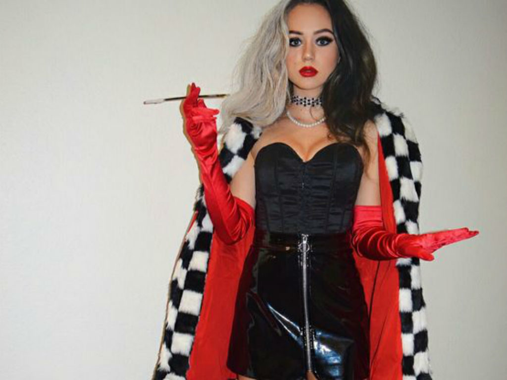 Alright, to be Cruella de Vil, you’ll need a black dress, black and white hair, and a crazy fur to go on top. You can absolutely opt for a faux fur, don’t worry. No need to cut your hair or find a wig because if you have everything else for this costume, you can get away with your hair the way it already is. But the black and white hair would be really fun.