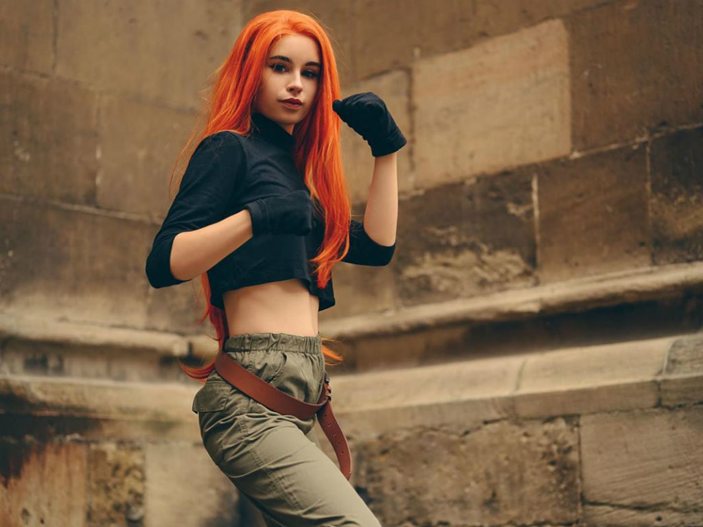 For the traditional Kim Possible costume, you don’t need much. Keep the idea of “less is more” when you find pieces for it. Feel free to interpret the details for yourself, like the pant length and the cut of the t-shirt. Just remember: black shirt, green pants with pockets, black shoes, and red hair— orange hair? Yes, please use that black fanny pack as a utility belt.