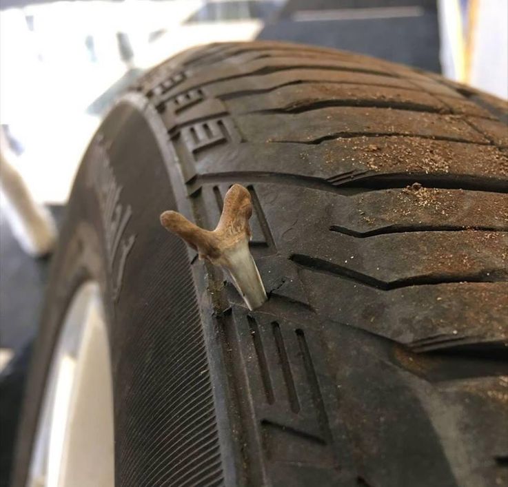 If you thought getting a flat car tire can only happen after driving over a nail, think again! There’s one lucky driver who discovered a shark tooth in his car tire! Since when do sharks cross the street?