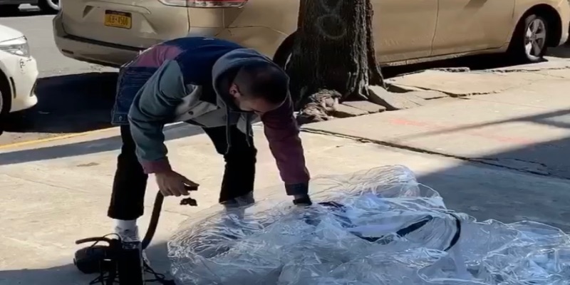 Jeremy rummages through his wardrobe. It had to be here somewhere! After flicking clothes and tripods around the room and searching pretty much everywhere, Jeremy finally found the thing he was looking for. It was an inflatable giant plastic ball he had bought a while ago for a fancy dress party. He grabs the pump and heads outside to inflate it.