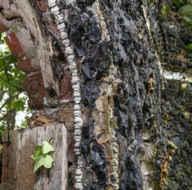 He worked hard to remove the ivy from the structure, slowly but surely revealing more of what was under it. He was surprised to find that a significant proportion of the building seemed to be made out of a conglomerate of oyster shells!