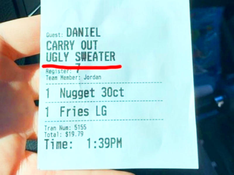 Daniel posted the ticket on Twitter, calling the restaurant out for their unprofessional behavior. Even though Daniel told the server his name, Jordan had decided to identify him by his opinion of his fashion sense, writing “ugly sweater” as well. “It was NOT MY PLEASURE TO EAT CHIC-FIL-A TODAY,” Daniel wrote, referring to the chain’s trademark sign off “my pleasure.” But he never expected his Goodwill sweater would become an online sensation.