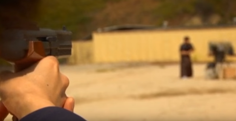 As the shooter is pointing the gun at Isao Machii, the Modern Samurai starts counting down the seconds before the bullet starts flying towards him. He doesn’t need to see, he only needs to hear the gunshot.