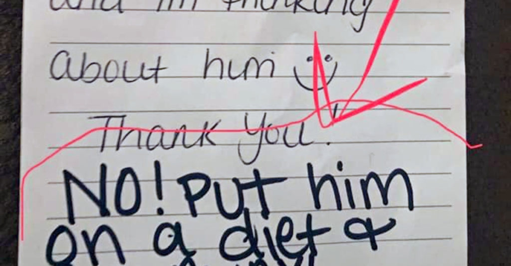 The note that the teacher had written underneath hers simply read: “No! Put him on a diet and go away.” Not only was this a flat-out refusal to relay the contents of the message she had so lovingly written to her own son, but it was also getting personal about her son’s weight! Now, Francesca was usually a mild-mannered woman who minded her own business, but this meant war.