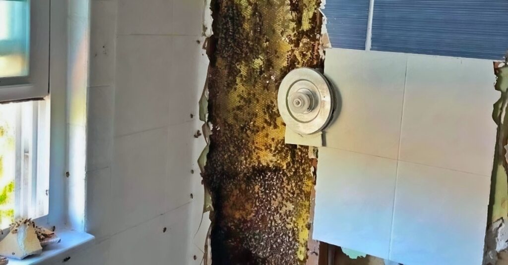 There was a giant hive hidden behind the Grahams’ shower walls! It was at least 7 feet tall. There were hundreds of thousands of bees, all humming and buzzing within the space in the wall.