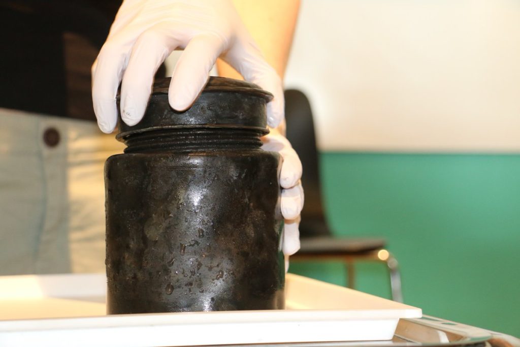 Just when researchers thought they unearthed nearly everything of importance, one of them came across this black tin jar nestled in the mud – and it was heavy. More gold and silver coins, perhaps?