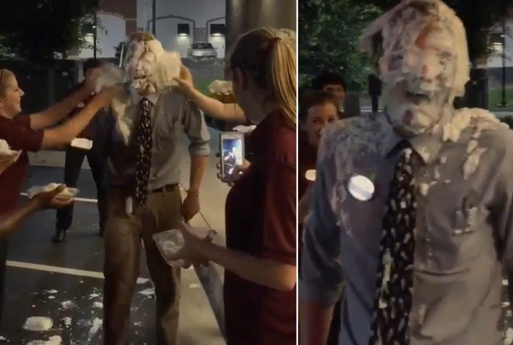 And it was indeed very special since this manager got not just a pie to the face, but more than 6! At one point he couldn’t even breathe!