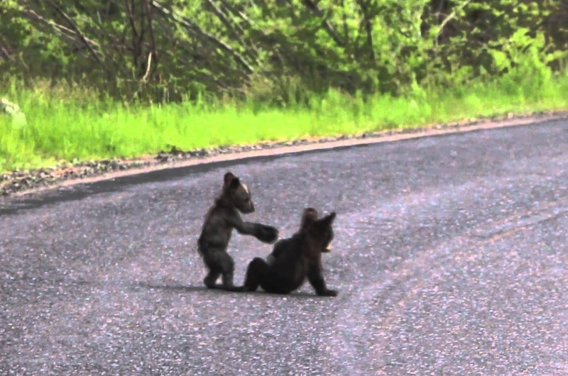 Cams are also put in places with animal crossings just in case there are accidents etc. This moment ended up flying across social media because the two cubs brought busy traffic to a grinding halt until their mom carried them away.