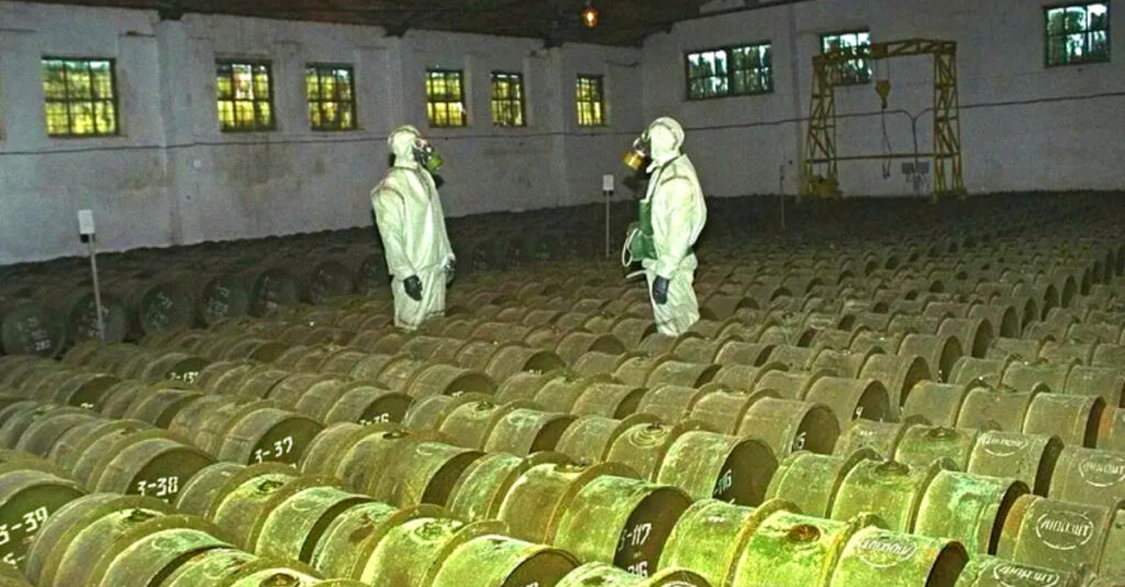 In this picture, you can see two Soviet scientists in protective suits while in a safe house for chemical weapons. This picture was taken in the 1960s, in the middle of the Cold War.