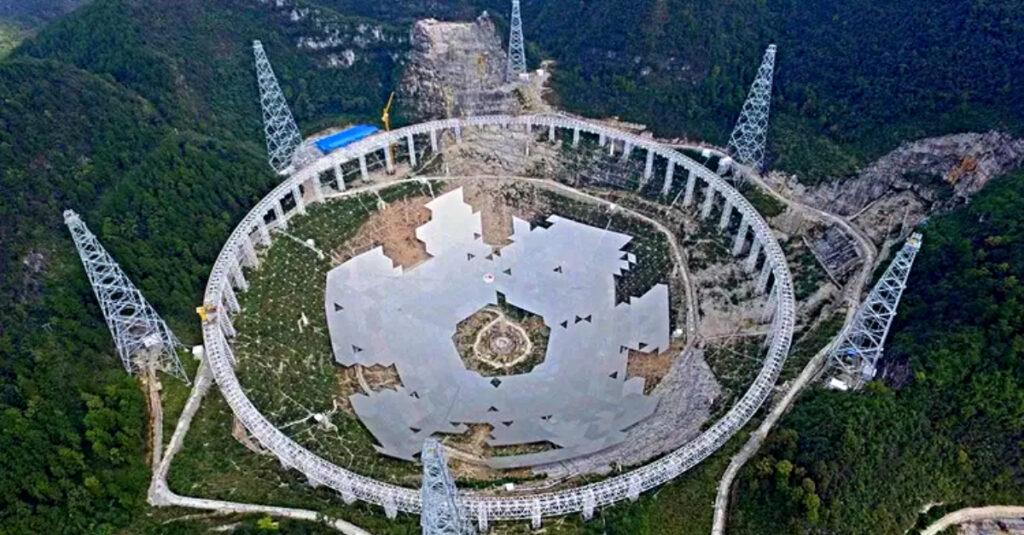 In this picture, we can see the Five-Hundred-Meter Aperture Spherical Telescope, which is known as FAST, or Tianyan, which means “Heaven’s Eye” in Mandarin.