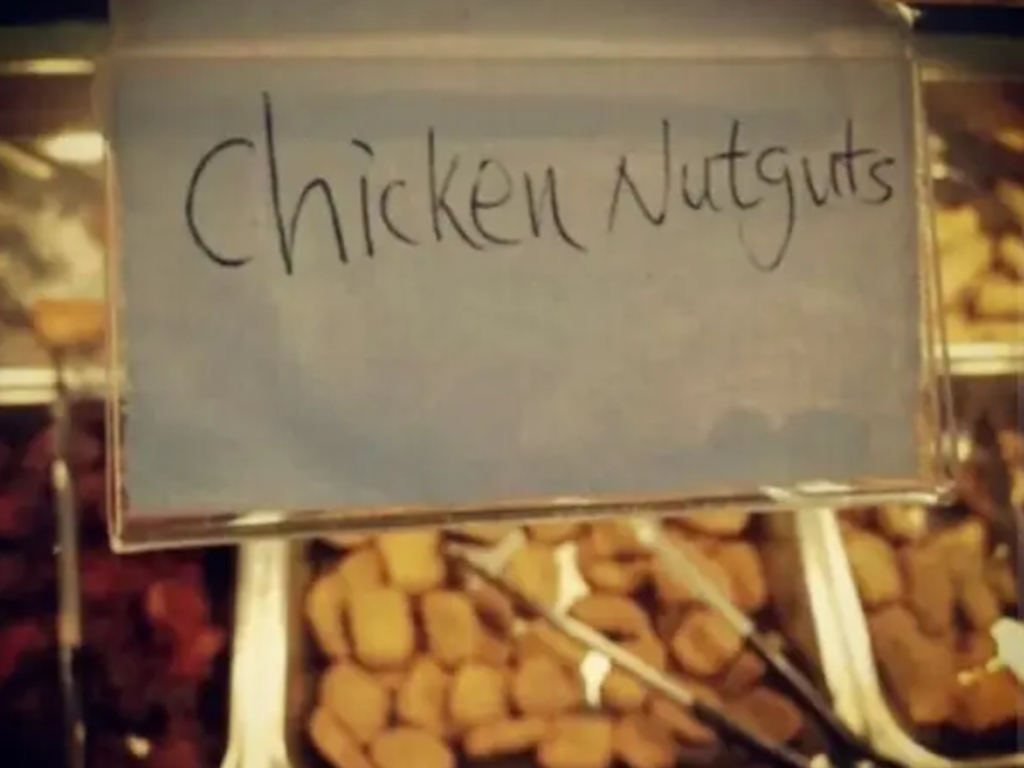 After he explains (and then shows) primary school students what goes into commercial nuggets, the result leaves their little noses scrunched in disgust. So, maybe this sign is accurate? Who knows.