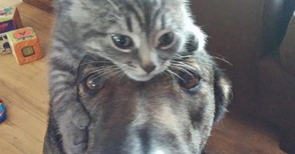 It’s not often you find an irresistibly comfortable place to rest. So when you do, it’s best to hold on tight. Especially when that place is on the top of your sibling’s head! This is a hilarious photo of a very patient dog and his little mischievous sister!