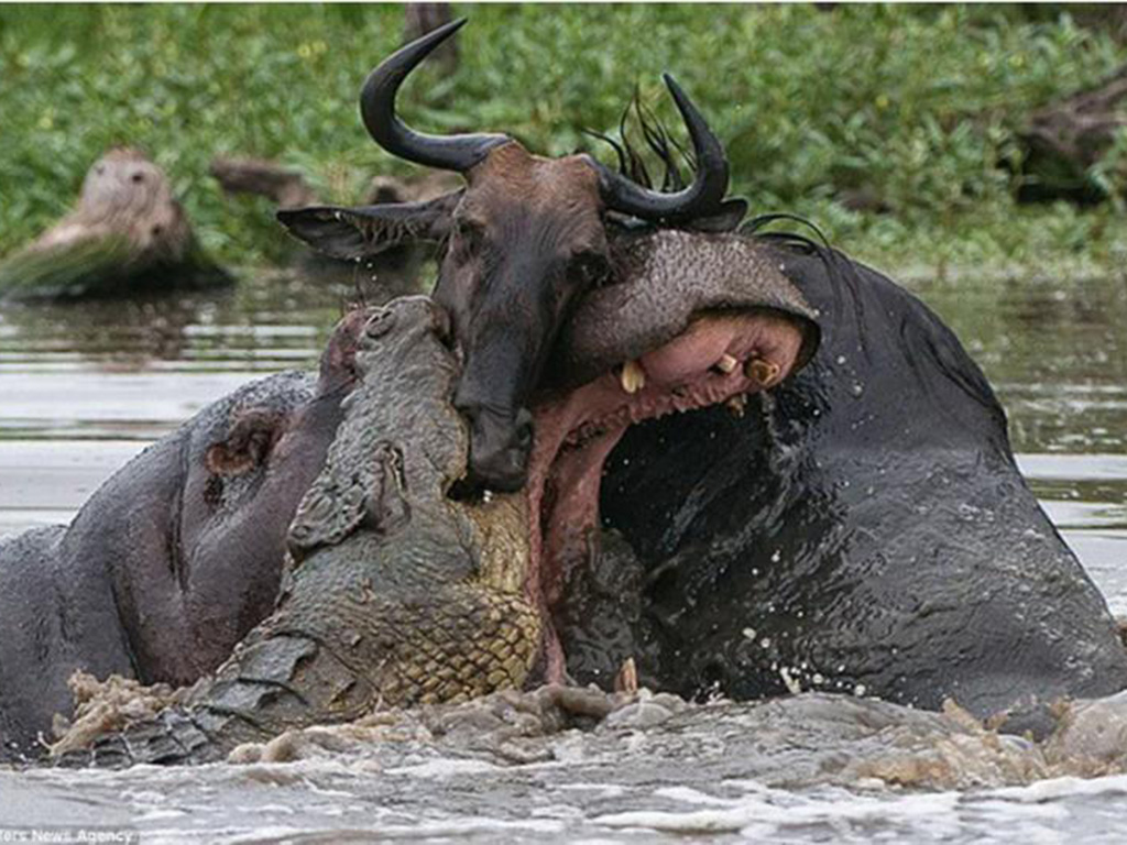 The brutality of nature is captured in this expertly timed photograph taken at the Kruger National Park in South Africa. Witnesses claim that the alligator sneaked up on the wildebeest and caught it in its enormous jaws, igniting the conflict. If a pair of hippos hadn’t emerged from the water to save the wildebeest, it would have been toast.