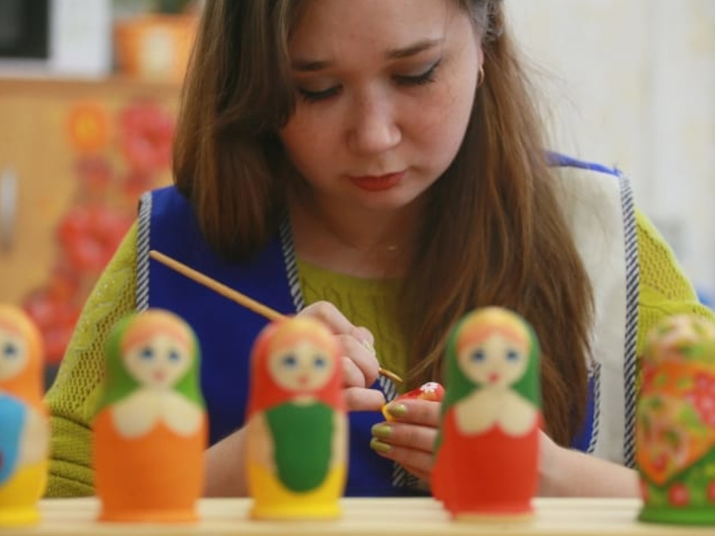 In this photo we see someone painting a Matryoshka doll. This tradition dates back to the late 19th century and continues to this day. The factory this worker is in also makes Russian woodenware and other souvenirs.