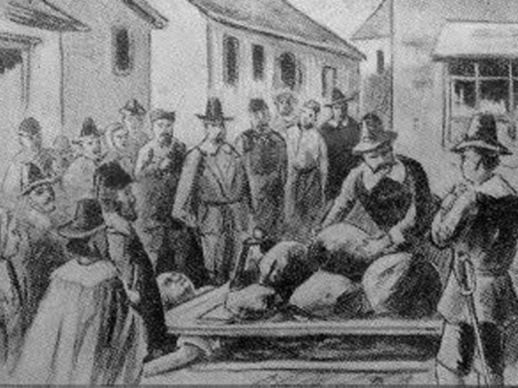 As well as hanging and drowning, an elderly farmer names Giles Corey was put on trial and executed by “pressing.” He was forced to lie down on a wooden board and squashed to death by heavy stones places on top of him, crushing him and suffocating him slowly. His execution came after he was accused of cursing three women. Records claim that Corey’s last words were, “More weight.” Remember the husband who testified against his wife? Well, that was Giles Corey.