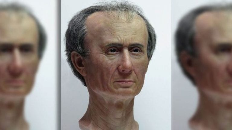 The bust we previously saw is in Rijksmuseum van Oudheden, in the Netherlands, and one more bust was scanned to render this rather strange image. We can say that the huge forehead and head are quite striking, compared to the small facial features.