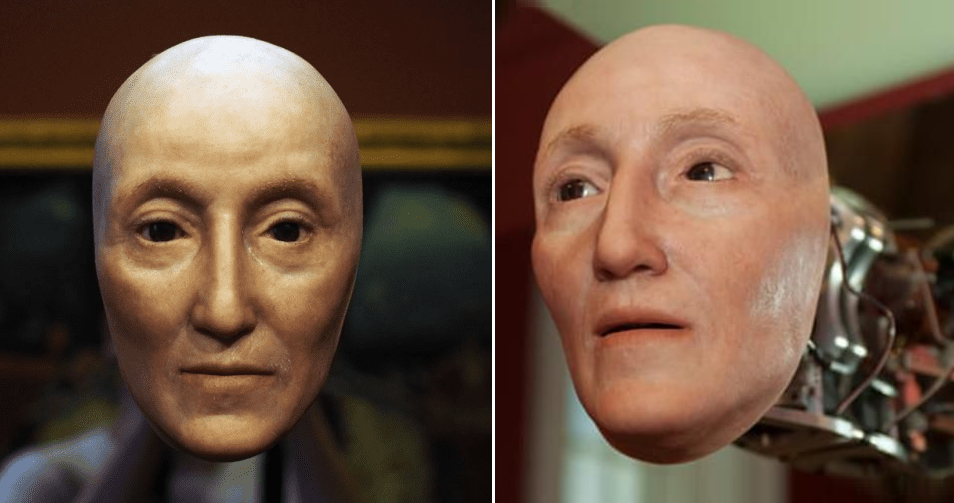 Artist Mat Collishaw used 3D printing and scans to create an animatronic face of the Virgin Queen. This one can blink! She does look a bit creepy with all the wires and mechanism seen from one side – and hairless…