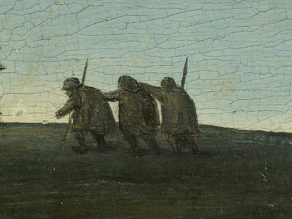 Within the “Netherlandish Proverbs,” art enthusiasts will find all sorts of fun proverbs like this interpretation of three blind figures, which represent the Dutch proverb “If the blind lead the blind, both will fall in the ditch.”