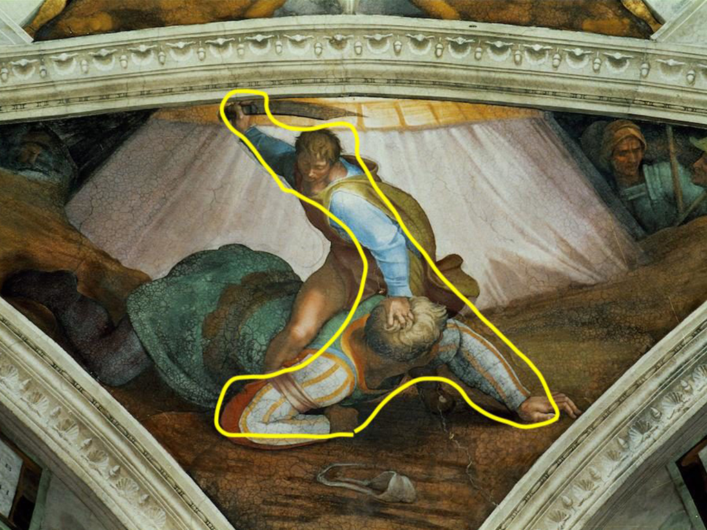 One of the panels on the Sistine Chapel shows David in the process of vanquishing Goliath the giant. But Michelangelo was clever enough to illustrate the Hebrew letter gimel with a little help from David’s stance. Gimel is symbolic of reward and punishment, which reflects the biblical story of David and Goliath.